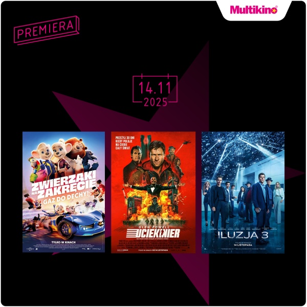 Od 14 listopada na widzów w kinach sieci Multikino będą czekały aż trzy premierowe propozycje – „Iluzja 3”, czyli kontynuacja uwielbianego hitu, w którym powrócę Czterej Jeźdźcy, „Uciekinier” z Glenem Powellem oraz produkcja familijna „Zwierzaki na zakręcie” . Szczegółowy repertuar jest dostępny na stronie www.multikino.pl.