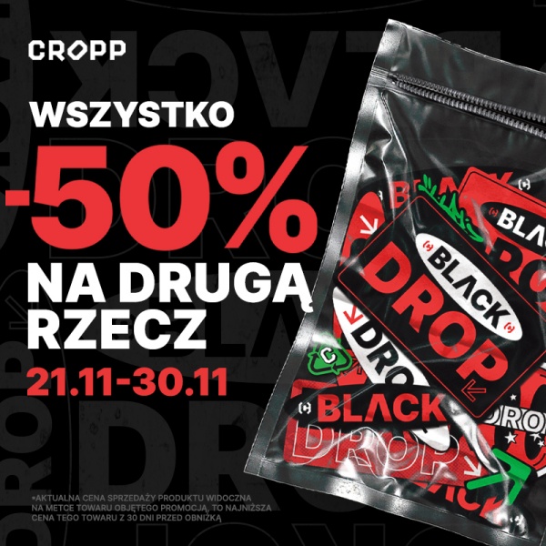 W dniach 21.11-30.11 we wszystkich sklepach Cropp startuje BLACK DROP. Wpadaj do sklepu i skorzystaj z promocji -50% na drugi produkt, na cały asortyment.