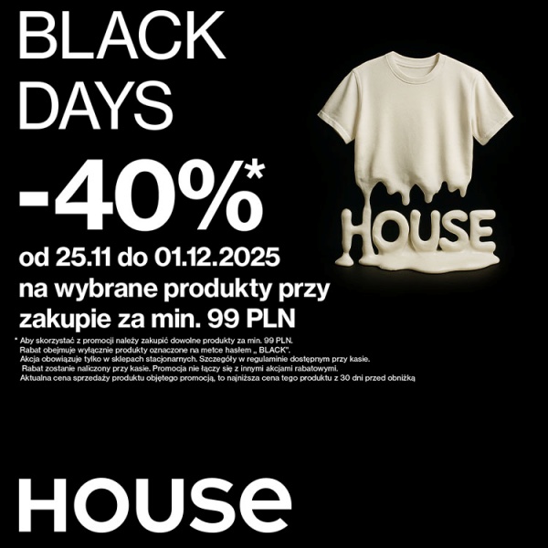 Black Days w House! Odwiedź nasze sklepy, aby skorzystać z dodatkowej zniżki: -40% na wybrane produkty. Promocja trwa do 1.12 – nie przegap! Więcej szczegółów na temat promocji znajdziesz w sklepach.