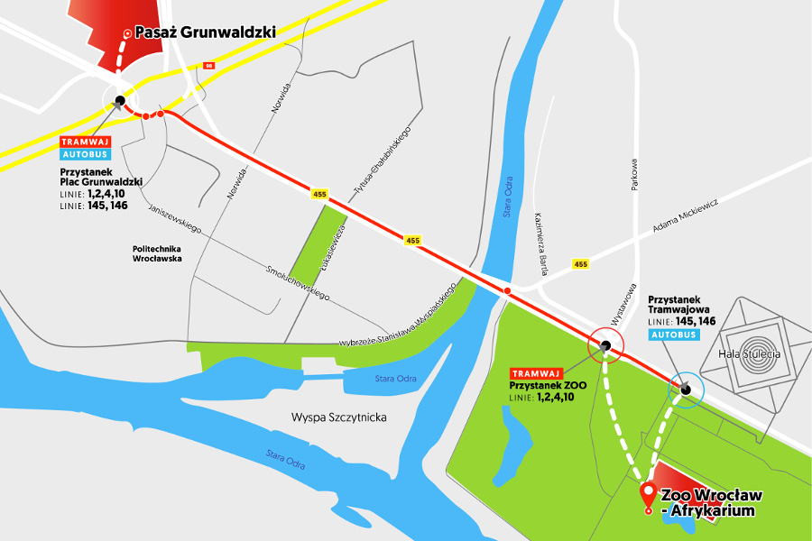 Planującym wakacyjną wyprawę do ZOO przypominamy, że dojazd tramwajem czy autobusem z przystanku „Plac Grunwaldzki” na miejsce docelowe zajmuje mniej niż 5 minut. Na trasie tej kursują aż cztery linie tramwajowe - 1,2,4,10 i dwie autobusowe – 145 oraz 146, czas oczekiwania na przystanku jest więc bardzo krótki.