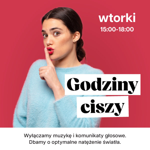 W każdy wtorek w godzinach 15:00-18:00 wyłączamy muzykę, ogłoszenia głosowe ograniczamy do minimum oraz przygaszamy oświetlenie. Wszystko po to, aby zakupy w naszym centrum były jeszcze bardziej komfortowe dla każdego, również dla osób preferujących spokojne zakupy w ciszy.