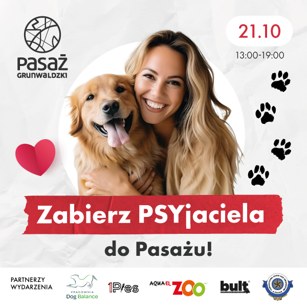 W sobotę w godz. 13.00-19.00 zapraszamy do udziału w evencie Zabierz PSYjaciela do Pasażu, pełnym dobrej energii i wesołych szczeknięć. Koniecznie odwiedźcie nas ze swoimi czworonożnymi pupilami!