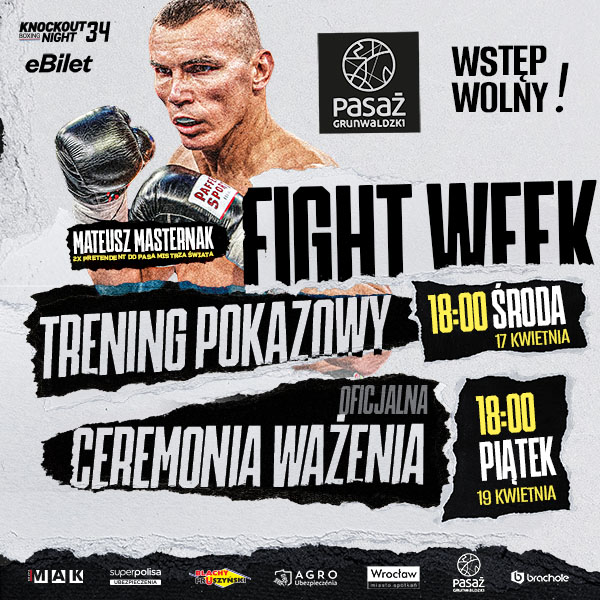 W środę o godzinie 18:00 odbędzie się trening pokazowy, w którym wezmą udział bohaterowie gali Knockout Boxing Night 34. Wśród nich jeden z najwybitniejszych polskich pięściarzy – Mateusz Masternak, dwukrotny pretendent do Pasa Mistrza Świata i były Mistrz Europy. W wydarzeniu weźmie udział również Rafał Wołczecki – wrocławianin i największy prospekt wagi średniej – a także niepokonany Kamil Bednarek, który ostatnie pojedynki toczył w USA.